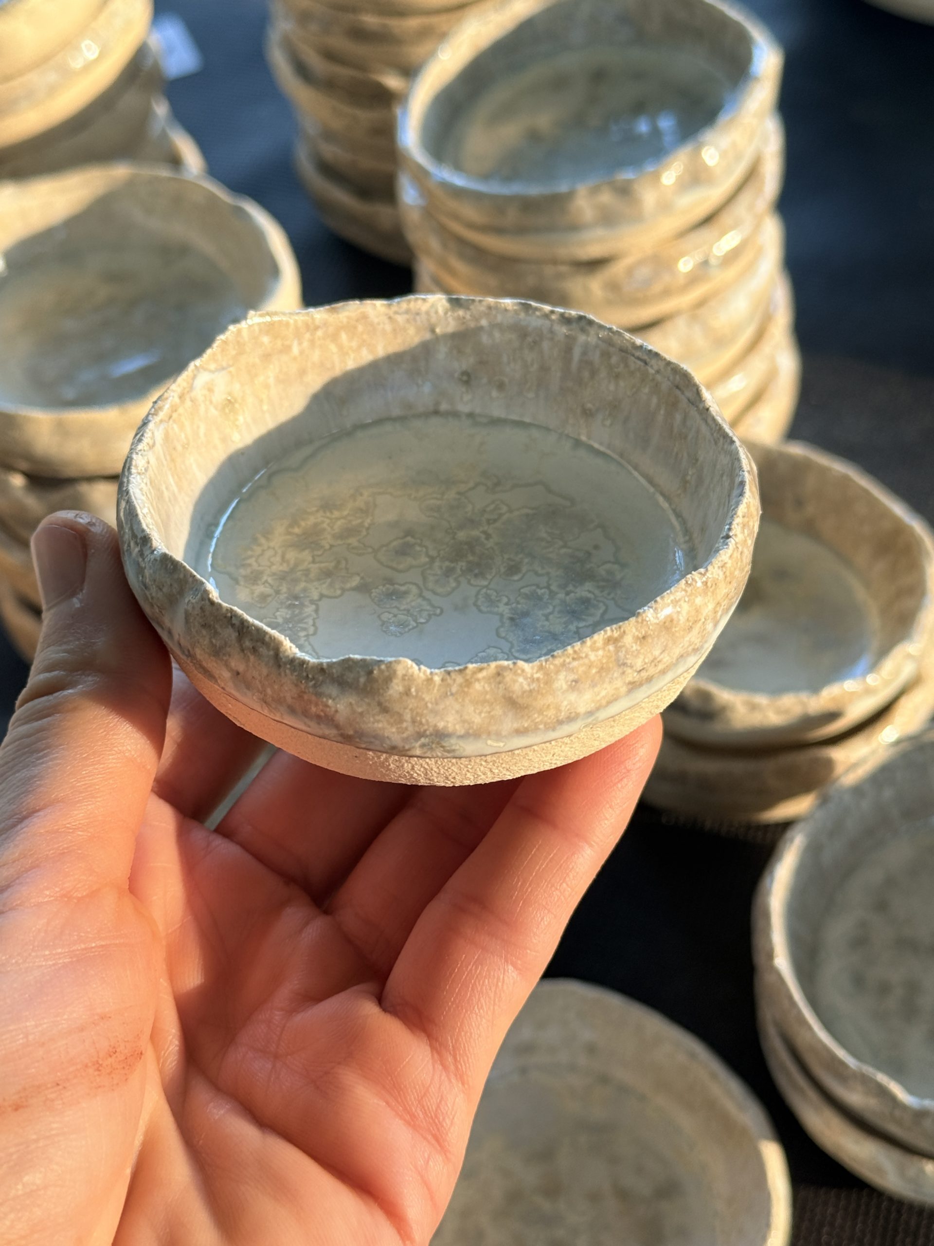 Toutes mes pièces sont réalisées à la main. Selon la collection, je tourne, je modèle, j’estampe et je coule la terre. Je réalise mes propres recettes d’émaux à haute température.